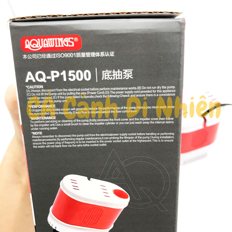 "Máy bơm hút đáy AQUAWINGS AQ-P1500 26W bơm chìm hút cặn 360 độ hồ cá AQP1500 là loại máy bơm dạng chìm với về mặt hút đáy rộng 360 độ có thể hút toàn bộ cặn bẩn, thức ăn thừa nằm dưới đáy hồ cá của bạn. Model: AQ-P1500 Xuất Xứ: Trung Quốc AQUAWINGS Trọng lượng sản phẩm: 500 gram. Kích thước hộp sản phẩm: 14 x 14 x 7 cm Thông số: Công suất: 26W ,Chiều cao cột nước: 2 Mét, Lưu lượng nước tối đa: 1500 L/ H Máy sử dụng: phi ống 12 li và phi 18 li kèm sẵn trong hộp sản phẩm Công dụng: Làm máy bơm nước hút đáy bề mặt Hướng dẫn sử dụng: máy bơm chìm dưới nước nên bạn để toàn bộ máy ngập trong nước. Lưu ý khi sử dụng: thường xuyên vệ sinh máy để máy hoạt động được tốt hơn, tuổi thọ máy được cao hơn. Khi đang chạy máy có hiện tượng dừng lại, ngắt nguồn điện, tháo máy xem có bị bám bẩn, lông, tóc bám vào moto."